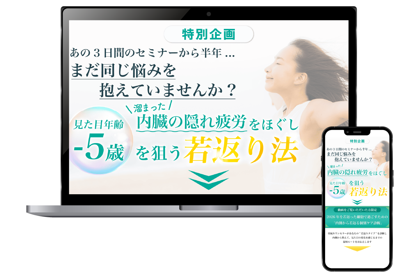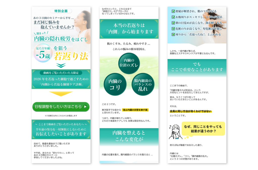 ユーザーの悩みを自然に自分ごと化させるため、ファーストビューでは共感を軸としたコピーを配置し、瞬時に興味を引きつける設計にしています。その後、原因提示から解決策へと段階的に納得感を高める構成とし、無理なく読み進められる導線を意識しました。また、「若返り」「-5歳」といった具体的なベネフィットを視覚的に強調することで、抽象的な価値を直感的に理解できるよう工夫しています。